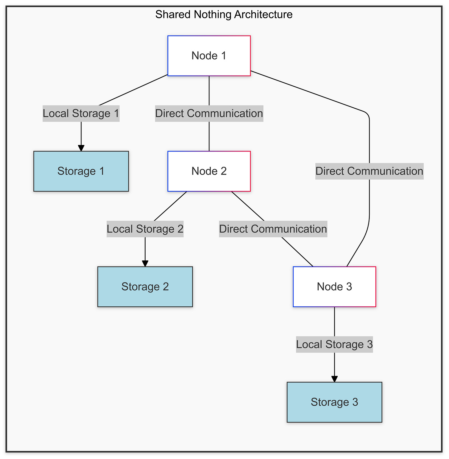 No Shared Resources: Nodes don’t depend on a central storage or memory pool.